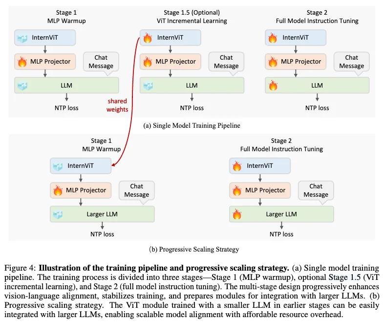 在 introduction 部分,作者指出不用 native 训练的话需要用特定的辅助数据,例如 OCR 来将不同模态进行对齐,预训练过程中需要冻结模型和多阶段训练等,比较复杂。与其先对仅文本的大型语言模型进行预训练,然后通过多模态对齐进行调整以支持视觉处理,不如让 InternVL3 在预训练阶段共同接触仅文本语料库和多样的多模态数据集,从而学习多模态能力。