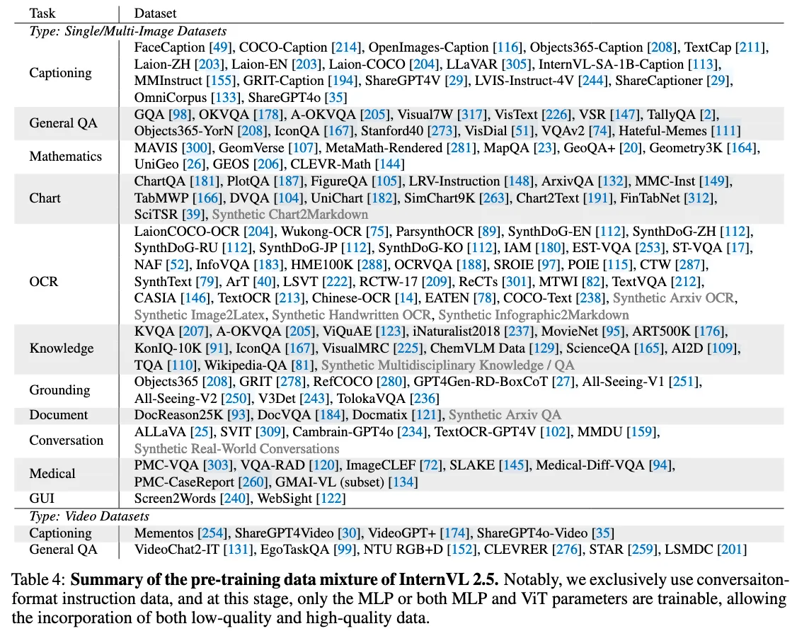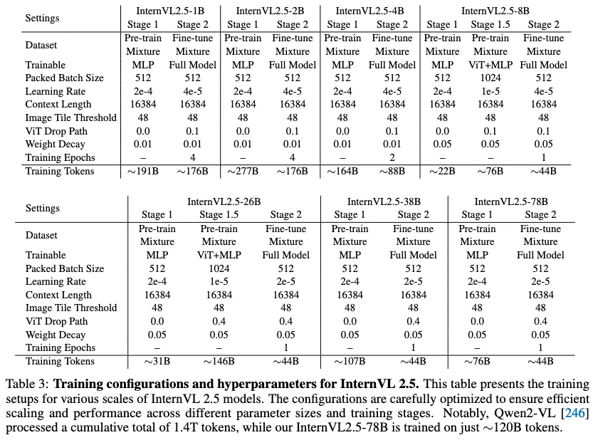 下面是不同尺寸模型的训练细节,上面作者强调说 ViT 的增量训练的过程中,即使在小的 LLM(20B)上训练,也能够很好的迁移到 72B 上(我确实不太明白为什么作者一直强调这个,从 InternVL 之前版本就开始强调了。。。)然后作者说使用的训练 Tokens 比 Qwen2-VL 少很多,Qwen2-VL 用了 1.4T Tokens