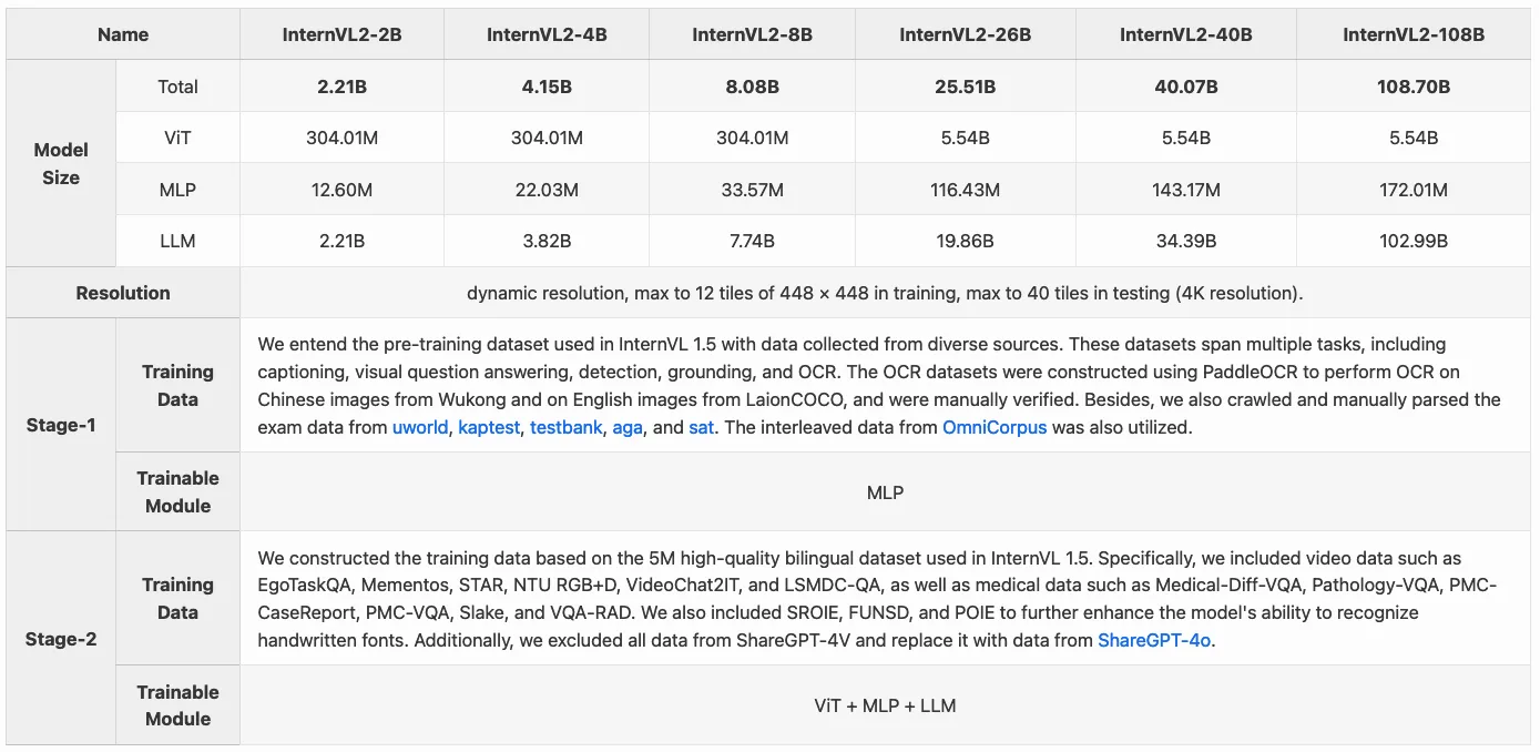 1. InternViT-6B-448px-V1.2:作者发现倒数第四层的特征表现最佳,因此抛弃了最后三层,将输入分辨率从 224 提升到 448,并与 Nous-Hermes-2-Yi-34B 模型进行对齐,同时训练 vision 和 mlp 部分,来提升整体性能