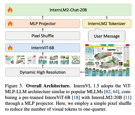 模型架构如下,在当时看来也没啥新鲜的地方,基本上大家都采用这种结构,ViT + MLP + LLM,这里用了 pixel shuffle 来降低 token 数量。视觉编码器用的是 InternViT-6B,语言模型用的 InternLM2-20B