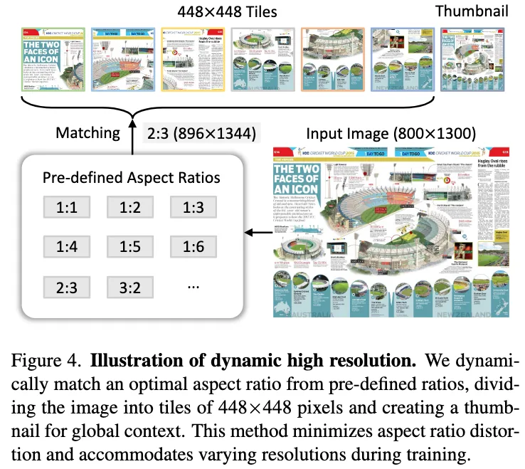 2. 通过动态分辨率,讲输入图像切成 1-40 个 tiles,每个 tile 448x448,最高支持 4k 分辨率