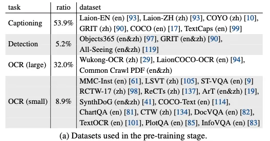 预训练数据集:captioning 包含 53.9%,Detection 和 Grounding 包含 5.2%,OCR 包含 32%,Smaller ocr 包含 8.9%