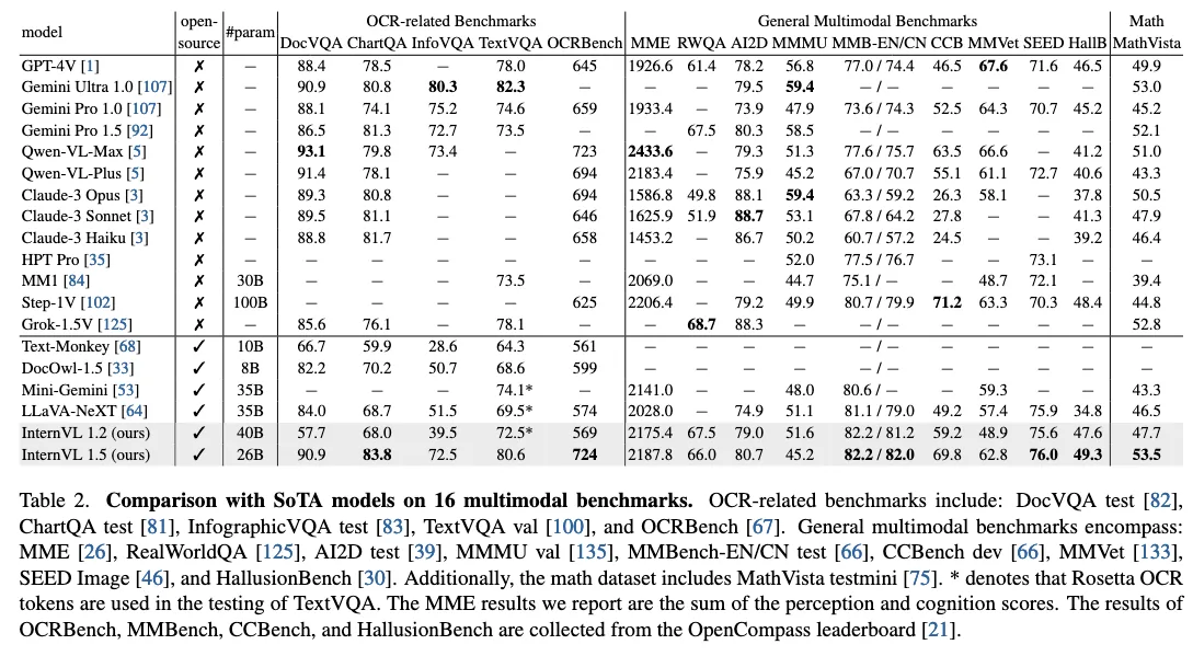下面是 18 个 benchmark 的结果,InternVL-1.5 在 8 个上达到了 SOTA