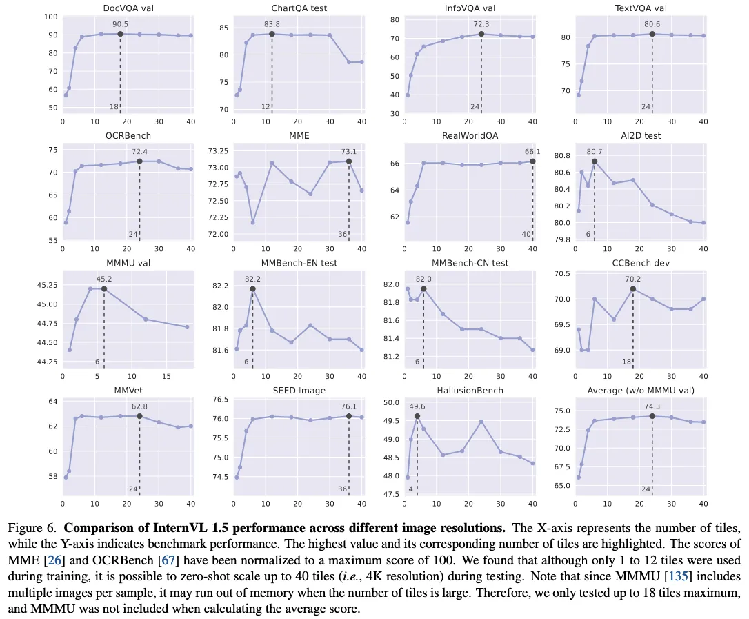 这里将输入图片处理成 1-12 tiles,也就是说一共 35 中可能的组合,例如 {1:1, 1:2, 2:1, 3:1, …, 2:6},如果输入图像是 800x1200,那么先 resize 为 896x1344,然后切成 2x3 的 tile grid。训练的时候切片为 1-12 tiles,推理的时候最多可以切成 40 tiles,也就是说 token 一共从 256 最多到 10496。可以从下图看到,这里的切片,其实是直接 resize 的,不是 padding,这样可能会造成一些文本等的畸变?