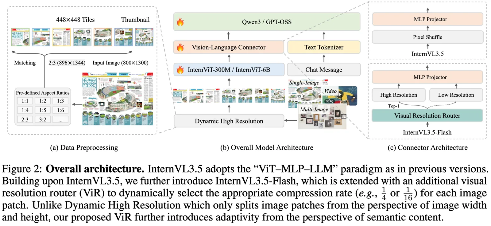 整体分为 InternVL-3.5 和 InternVL-3.5-flash,架构和初代的 InternVL-1.5 版本没什么本质的区别,其中 InternVL-3.5-flash 加了一个 Visual Resolution Router (ViR) 模块,原来的 InternVL-3.5 中使用的是 Pixel Unshuffle 来处理高分辨率图像,降低 token 为原来的 1/4,这里的 ViR 可以进一步降低到原来的 1/16