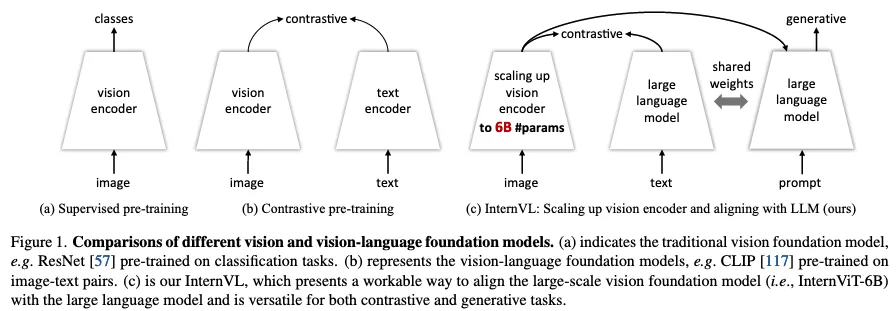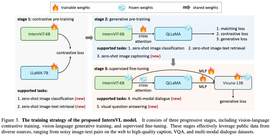 本文的主要贡献点:提出了 InternVL,scale 了 vision 部分,并且取得了 SOTA 的结果。(we formulate the InternVL, a large-scale vision-language foundation model, which aligns the representation of the scaled-up vision encoder with the LLM and achieves state-of-the-art performance on various visual and vision-language tasks.)简单来讲贡献为(1)vision 和 llm 部分的参数均衡(2)采用预训练的多语言 LLaMA 来初始化中间层,将 vision 和他对齐(3)渐进式的图文对齐:先用 noisy 的图文数据,然后转移到细粒度的图文数据