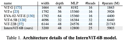 整体架构如下所示,作者还给定了 InternViT-6B 的整体尺寸