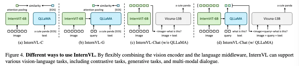 从上图可以看出来,对于对比学习,图像 feature 一个是直接从 InternViT 中得到,一个是通过 QLLaMA 之后再获得。text feature 均来自 QLLaMA。对于后面的生成任务,QLLaMA 可以加也可以不加,其实我这点挺疑惑的,不是很懂为什么要这么做,可能是觉得方法的通用性?