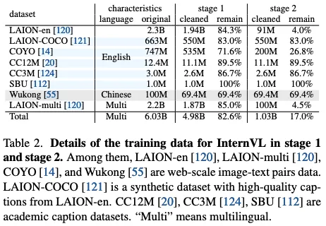 第一部分对比学习的数据集如下,一共有 6.03B 数据经过清理之后只保留了 4.98B