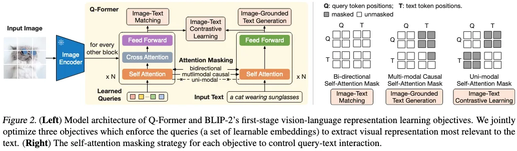 第二阶段采用生成式学习方法:这里除了 InternViT-6B,和 LLaMA,还引入了 cross attention layers,这里只微调可学习的 query 和 cross attention layers,其他的都 freeze 住。在第一步的基础上,把数据集从 4.98B 缩小到 1.03B。参考 BLIP2 的训练方法,loss 分为三部分,image-text contrastive (ITC) loss, image-text matching (ITM) loss, and image-grounded text generation (ITG) loss。这里老哥看了一下,和 BLIP2 不能说完全不同,只能说一毛一样。注意这里的对比损失(图中最右边),mask 的部分其实是为了 q 和 t 不相互干扰,因为这两个在计算 loss 的时候是不能相互看到的,因此是单一模态的 mask