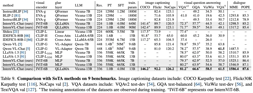 这里有一些 zero-shot 的分类检索等指标,测试 InternViT-6B 的,这里就不介绍了,直接看多模态的 benchmark。这里其实有点误区,直接看结果吧。PT 和 FT 的数据量和 train params 感觉介绍的不是很清晰,再补充材料 A.4. Data Preparation for Pre-training 有相关介绍,有兴趣的同学可以看一下