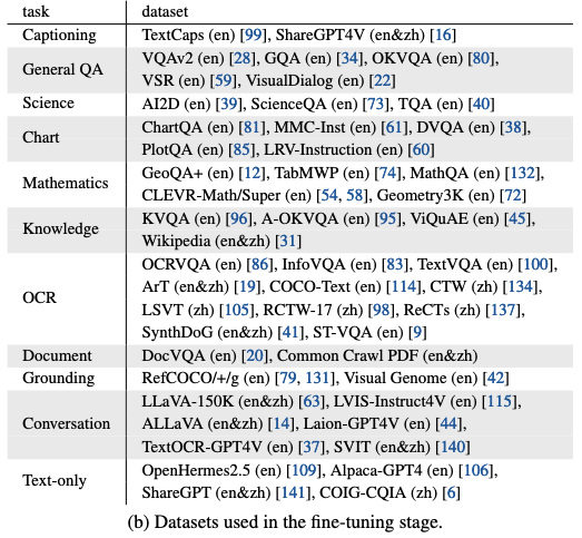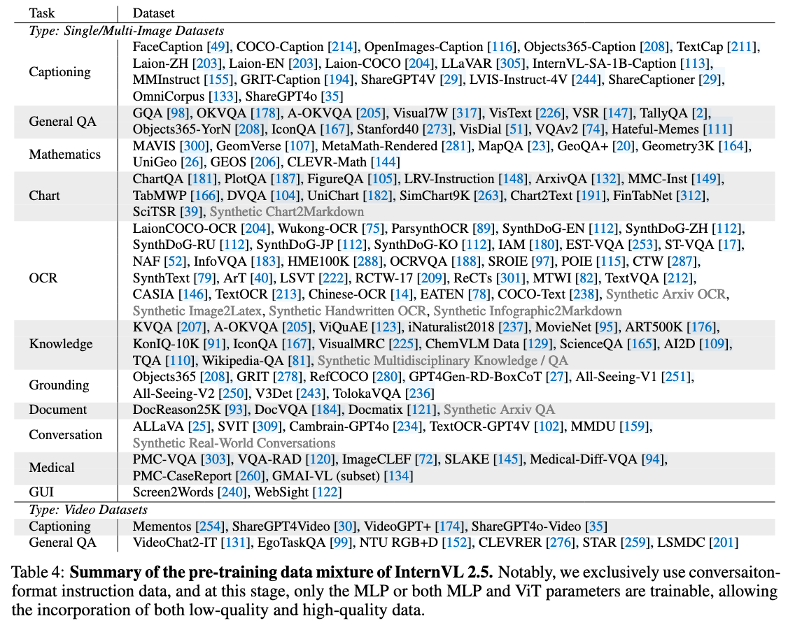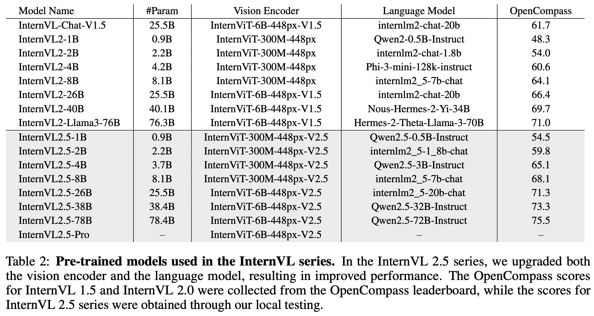 下面是不同尺寸模型的训练细节,上面作者强调说 ViT 的增量训练的过程中,即使在小的 LLM(20B)上训练,也能够很好的迁移到 72B 上(我确实不太明白为什么作者一直强调这个,从 InternVL 之前版本就开始强调了。。。)然后作者说使用的训练 Tokens 比 Qwen2-VL 少很多,Qwen2-VL 用了 1.4T Tokens