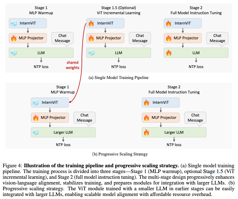 一共有三个主要的设计:(1)progressive 的训练,从小的 llm 到大的 llm(2)多模态输入,接受文本,图片,视频和医学数据(3)多任务的输出,包含文本,图像,bounding box 等等,这里不是统一的建模,而是利用了其他任务的 decoder
