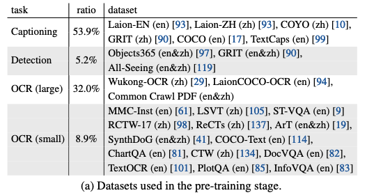 预训练数据集:captioning 包含 53.9%,Detection 和 Grounding 包含 5.2%,OCR 包含 32%,Smaller ocr 包含 8.9%