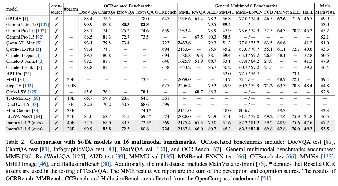 下面是 18 个 benchmark 的结果,InternVL-1.5 在 8 个上达到了 SOTA