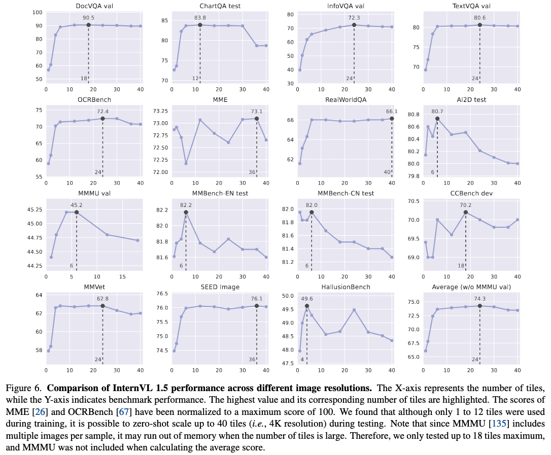 本文的一大改进有三点:(1)更强的视觉编码器(2)动态分辨率,将输入分为 1-40 个 tiles,每个 tile 448x448,以最高支持 4k 分辨率(3)跟高质量的双语数据。在 18 个 benchmark 中,在 8 个上达到了 SOTA