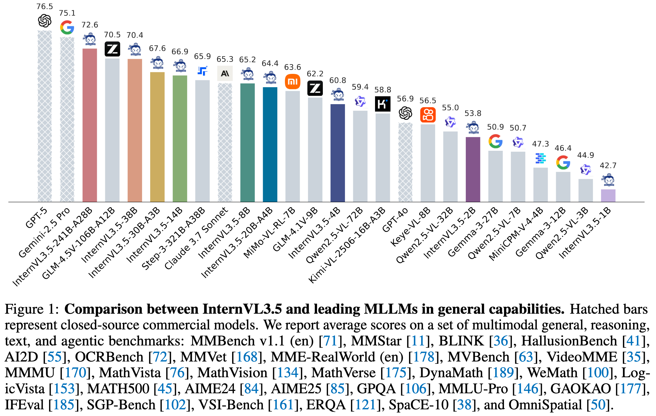 总结一下,InternVL-3.5 提出了 Dense 和 MoE 的版本(在此之前没有 MoE 版本),提出了一系列的策略(如上)来提升模型性能和推理速度等,最后就是模型整体性能达到了一个很高的标准