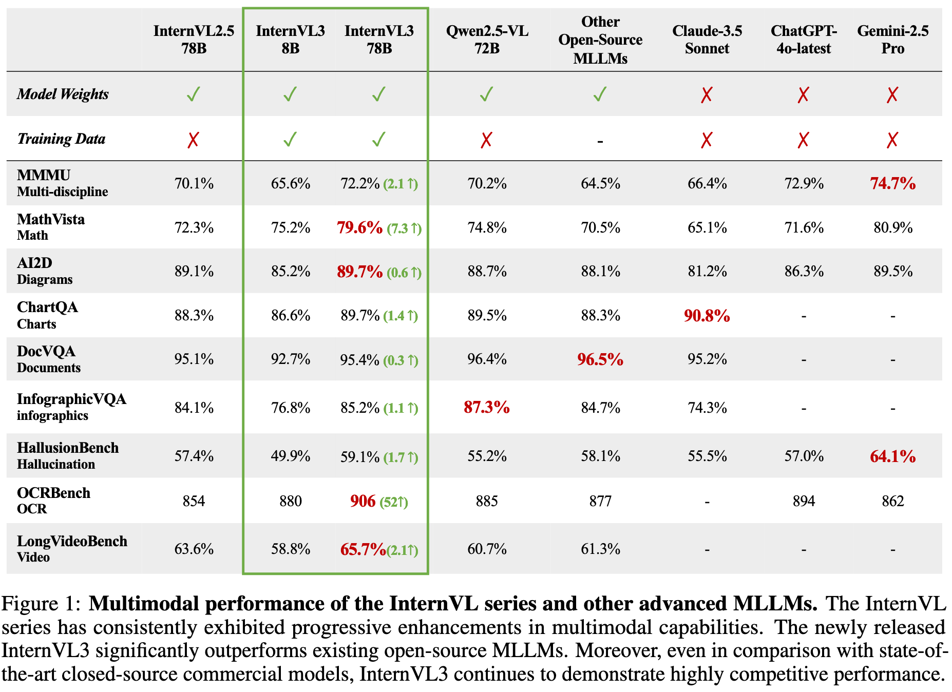 下面是作者在 introduction 部分的指标对比,InternVL-2.5 性能也是遥遥领先