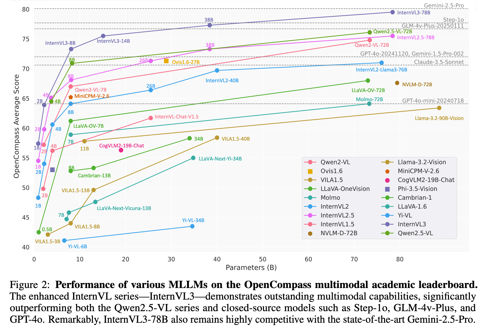 这篇文章是基于 InternVL-2 的改进,重点在训练测试以及数据质量上。根据原文:“systematically exploring the performance trends in vision encoders, language models, dataset sizes, and testtime configurations.”