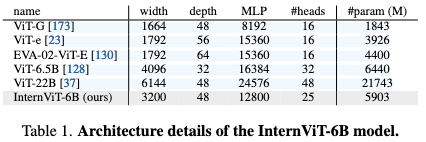 整体架构如下所示,作者还给定了 InternViT-6B 的整体尺寸